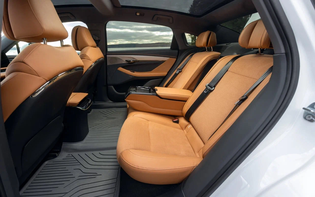 На заднем ряду просторно, особенно с правой стороны, где можно разложить кресло, выставить подставку для ног и управлять функциями через отдельный сенсорный экран. Подогрев, вентиляция и массаж доступны для обоих пассажиров, однако климат-система теперь двухзонная (ранее — четырёхзонная).