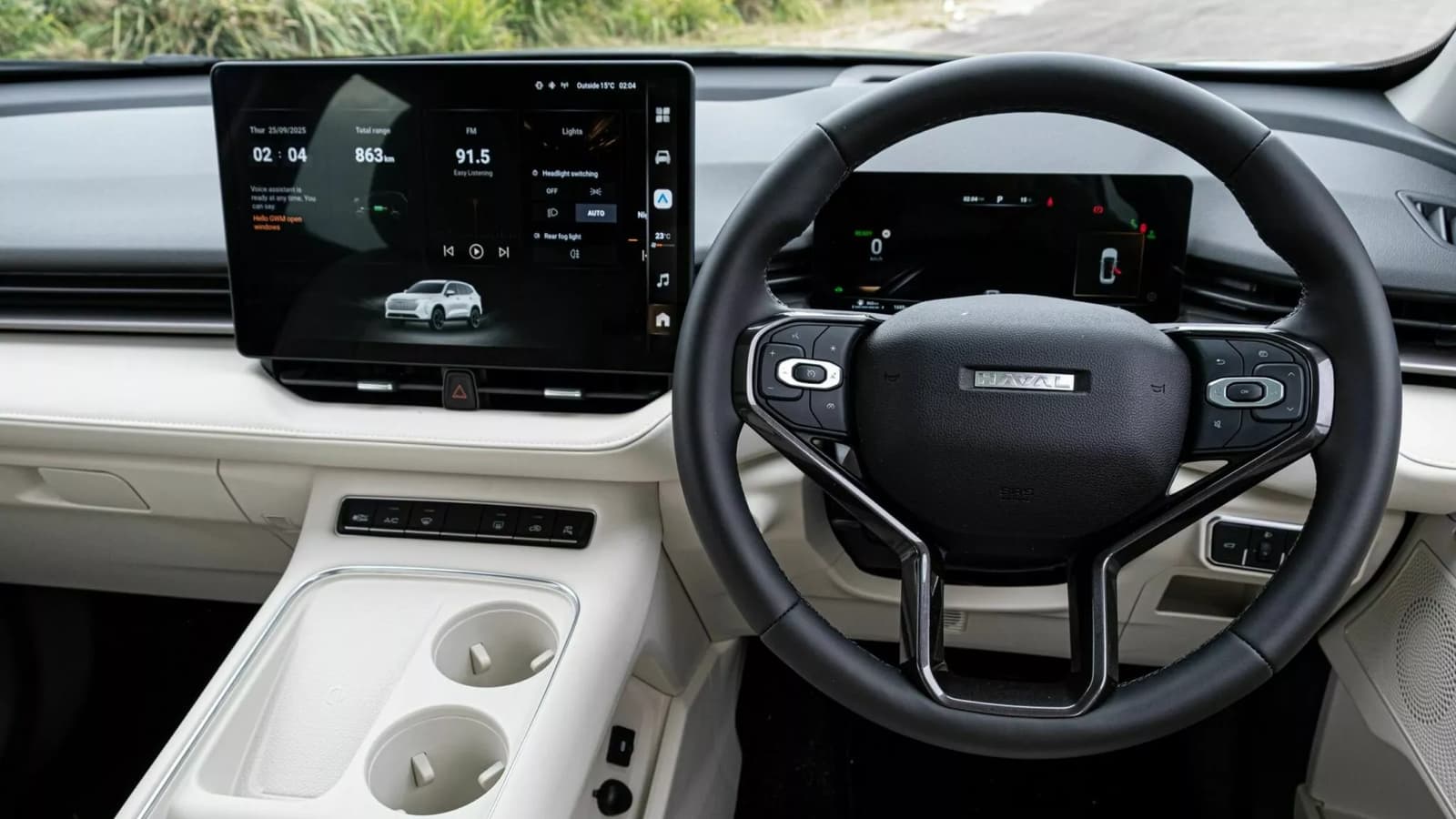 Главные изменения скрываются внутри. Интерьер выполнен в типичном для современных китайских моделей стиле — минимализм с акцентом на технологии. Центральное место занимает большой 14,7-дюймовый экран мультимедийной системы, дополненный виртуальной приборной панелью. Интерфейс обновлён и стал удобнее, особенно по сравнению с прежними поколениями Haval. В наличии беспроводные Android Auto и Apple CarPlay, беспроводная зарядка, акустика с металлическими решётками динамиков и приятные на ощупь материалы отделки. Кремовая кожа, используемая в тестовом экземпляре, визуально делает салон просторнее и светлее.