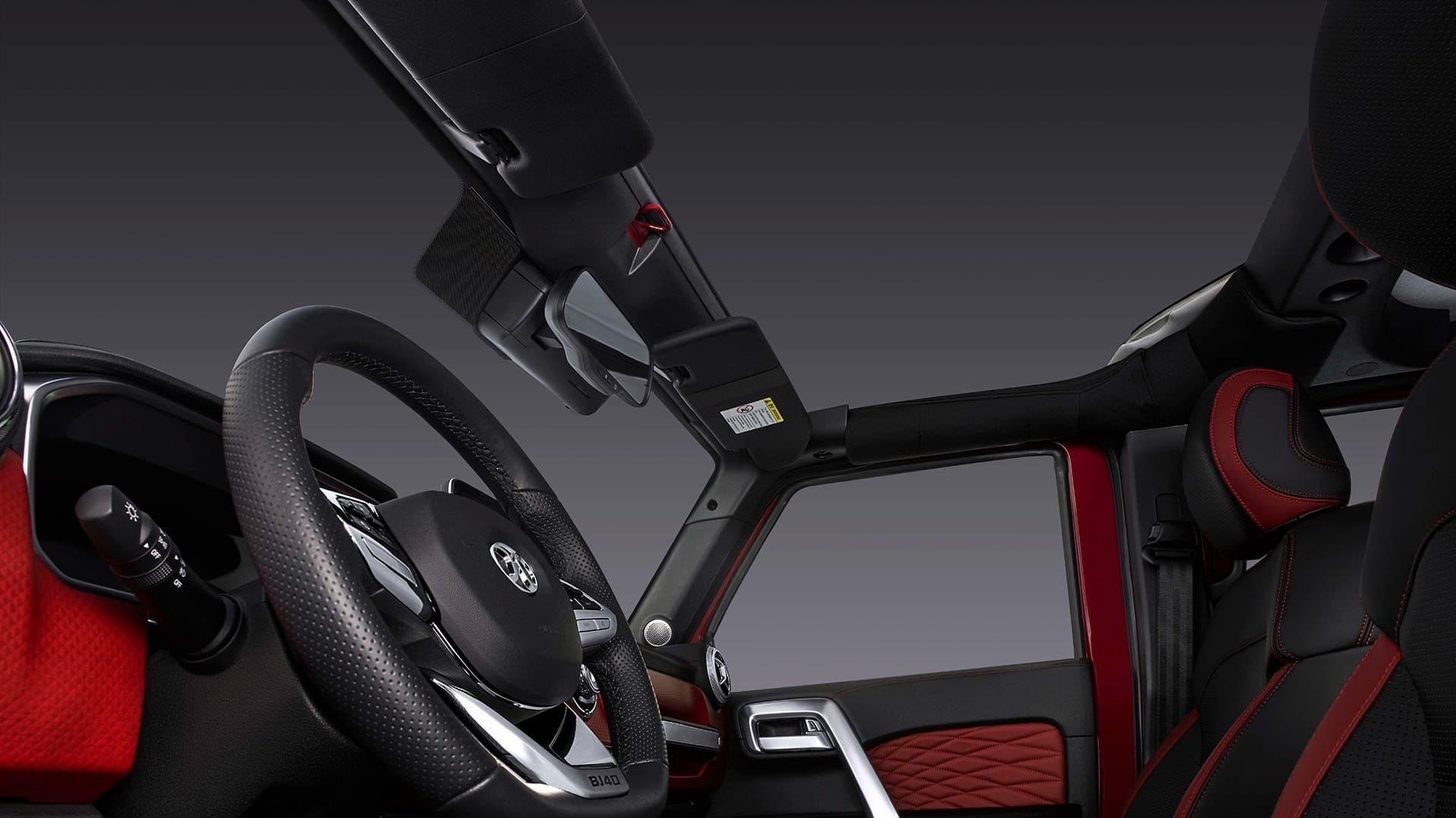 В салоне — смесь «джиперской» жёсткости и старой доброй эргономики, вдохновлённой ранними моделями Mercedes-Benz. Крыша снимается частями, двери быстро демонтируются, силовой каркас скрыт под мягкими элементами, приборы простые и честные, без мультяшного оформления. Дверные петли открываются на широкий угол, посадка высокая, а багажник, хотя и ограничен крупными арками, открывается по частям: отдельно стекло или створа полностью. Электронных ассистентов минимум — это внедорожник старой школы.