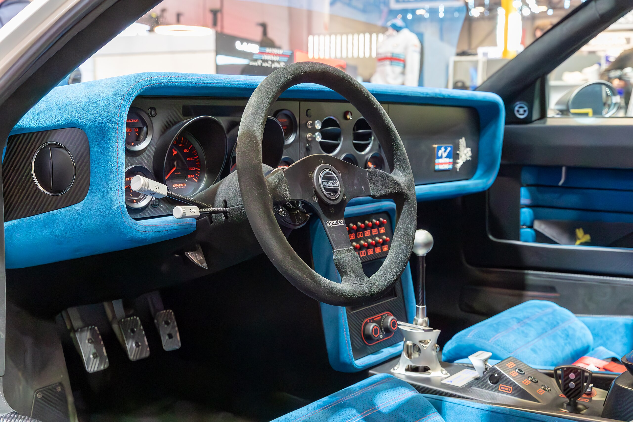 Салон сочетает аскетизм раллийной машины и аккуратность ручной сборки. Почти все поверхности отделаны алькантарой и матовым углепластиком. Посадка традиционно итальянская: руль Momo близко, педальный узел смещён. Аналоговые приборы сохраняют моментальное восприятие информации.