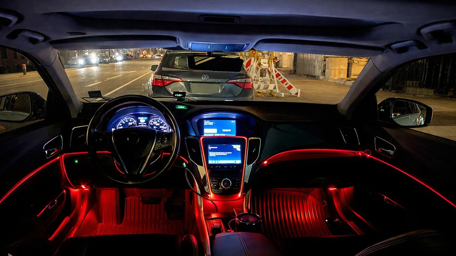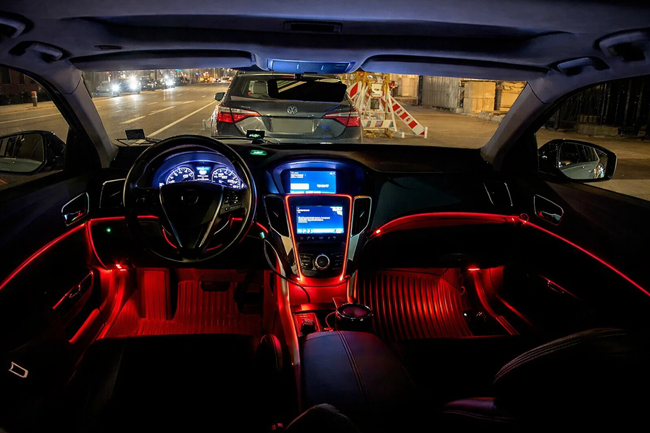 Заводские плафоны внутри автомобиля допускается заменять на светодиодные лампы любого оттенка. Подсветка зоны ног водителя и пассажиров обычно выполняется с помощью LED-лент стоимостью от 300 рублей. Панель приборов, центральную консоль и напольный тоннель нередко оформляют RGB-подсветкой. В продвинутых вариантах такие системы синхронизируются с музыкой и управляются через смартфон.