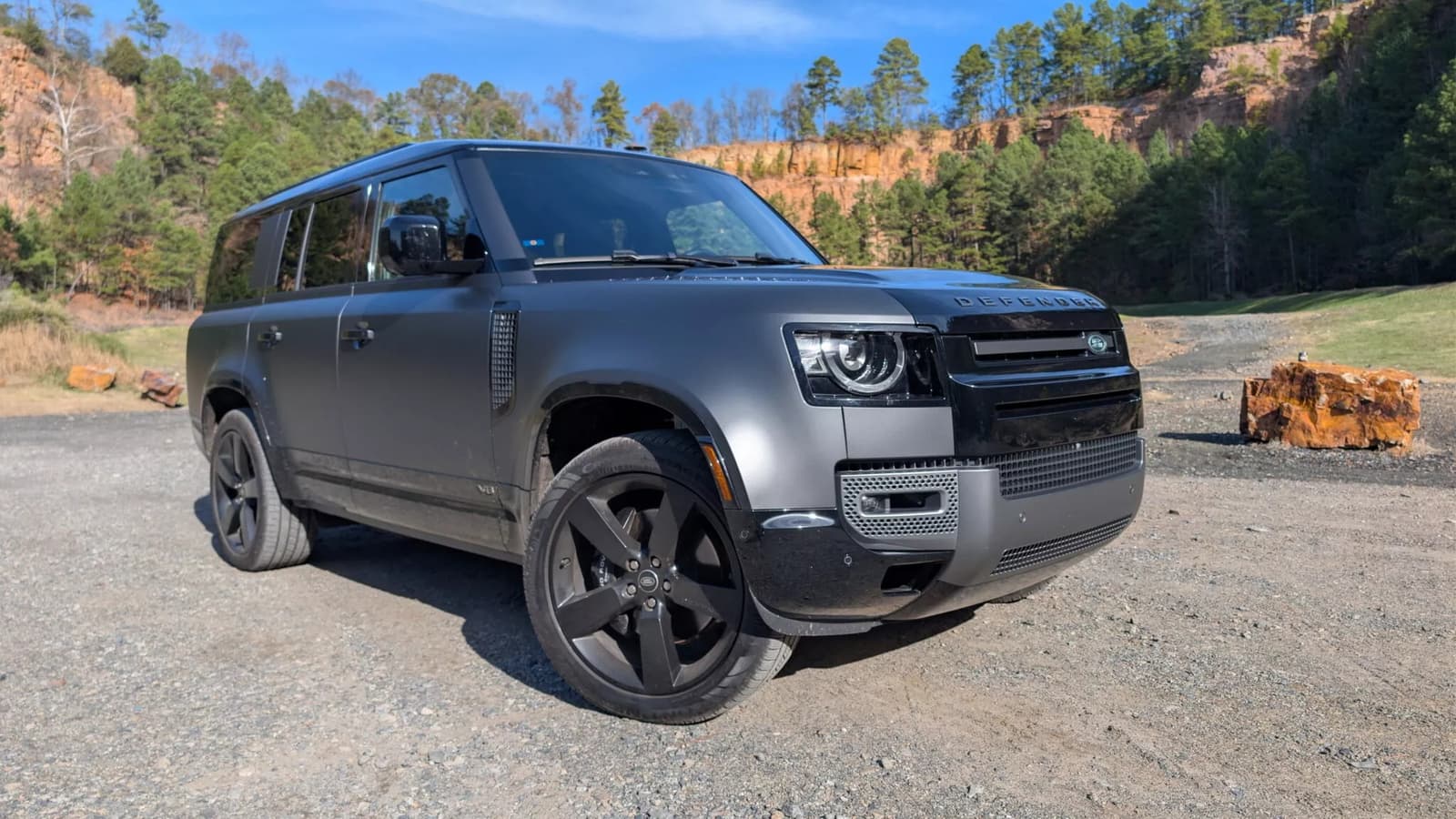 С точки зрения дизайна Defender 130 многими воспринимается как самый гармоничный в линейке. Он сочетает грубую геометрию старых Defender с современными пропорциями и дорогими деталями. При этом не обошлось без спорных элементов — декоративные панели на задних стойках и пластиковые накладки на капоте скорее стилистические, чем функциональные. Однако покупателей это, судя по всему, не смущает: модель привлекает внимание на дороге, особенно в матовом чёрном исполнении, как у тестового автомобиля.