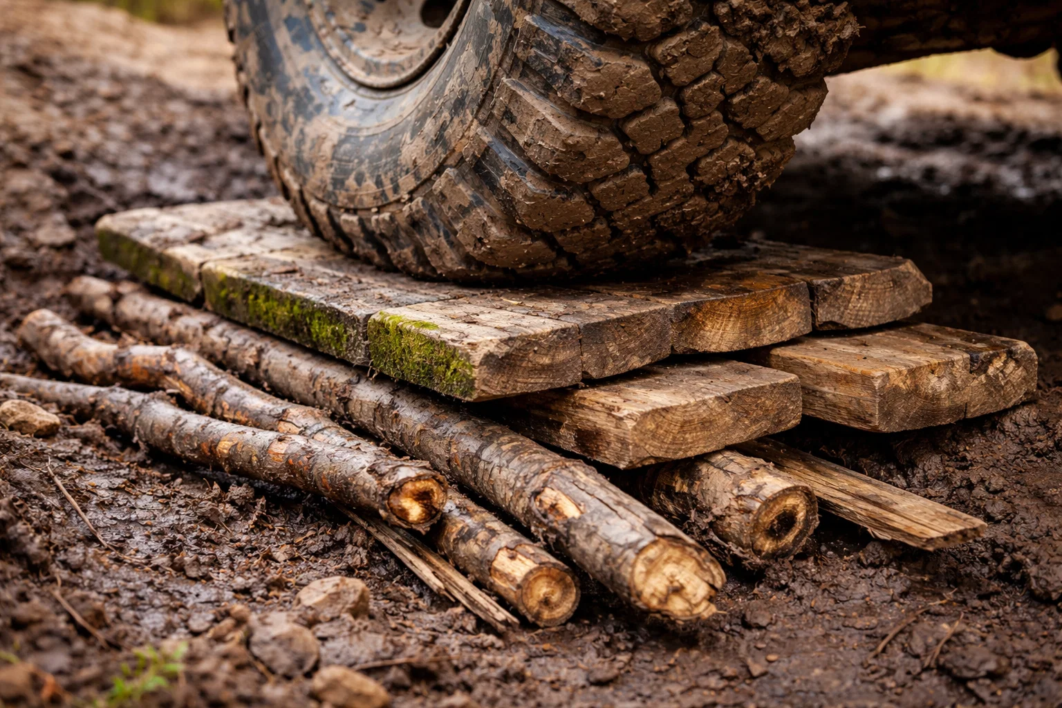 Если углубление серьёзное, можно усилить эффект. После небольшого продвижения вперёд участок под колёсами заполняют подручными материалами: ветками, досками или любыми твёрдыми предметами, способными создать опору.