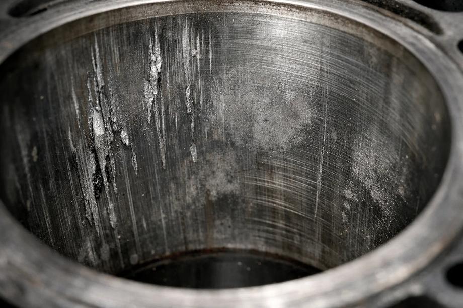 Если говорить простыми словами, задир представляет собой локальное разрушение поверхности гильзы. Внешне он может проявляться по-разному: от едва заметного матового участка до набора параллельных царапин или даже глубокой борозды. Независимо от формы, результат один — компрессионные кольца теряют способность герметично удерживать топливовоздушную смесь во время сжатия.