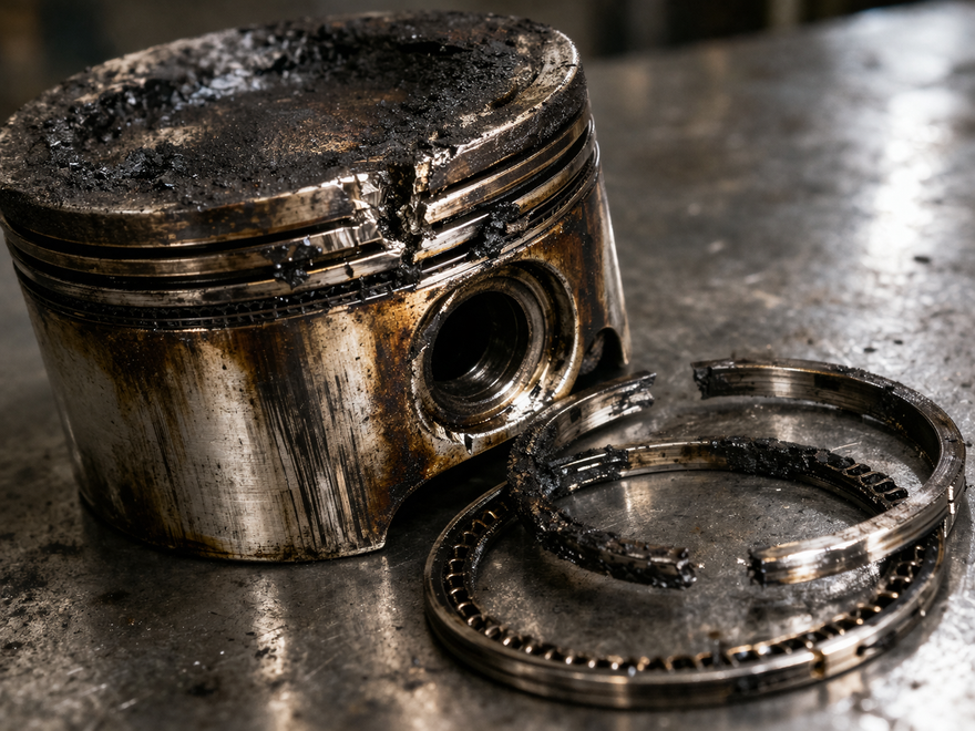 Однако основная проблема заключается не столько в потере мощности отдельного цилиндра, сколько в более серьёзных последствиях. Через микроскопический зазор между кольцом и повреждённым участком в камеру проникают раскалённые газы. Эти продукты сгорания: