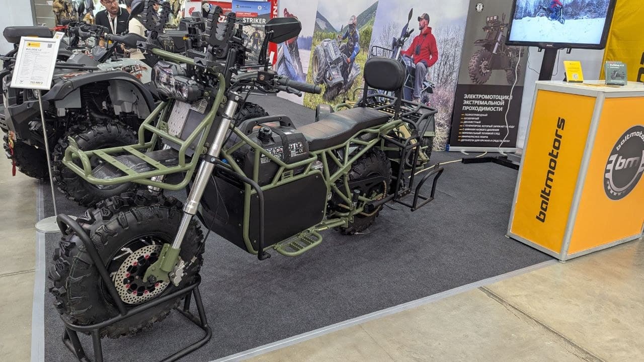 В Москве на выставке «Мотовесна`26» показали новый российский многоцелевой армейский внедорожный электромотоцикл Bulldog 4.0 от компании Baltmotors. Модель получила полный привод и колёса низкого давления, что позволяет использовать технику на сложном бездорожье, включая снег, песок и заболоченные участки.