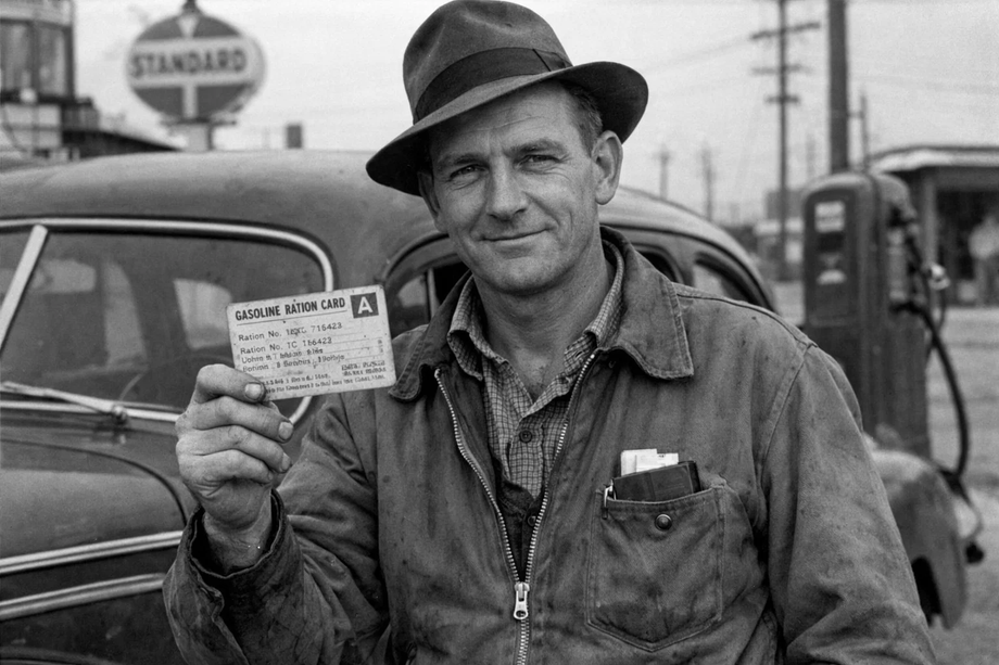 Дефицит каучука дополнялся нехваткой топлива. В результате власти ввели строгую систему нормирования бензина. Каждый водитель получал карточку, определяющую объём доступного топлива.