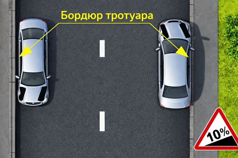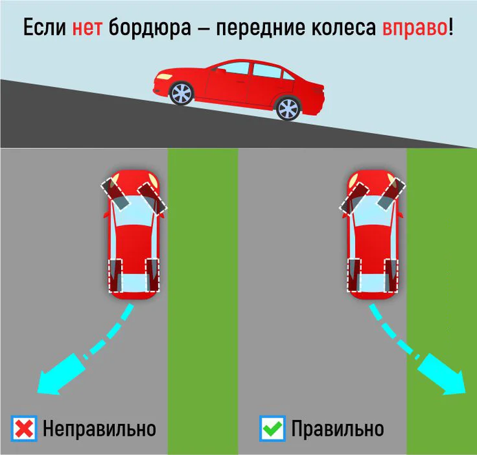 - если бордюра на склоне нет, то нужно направлять колёса так, чтобы в случае отказа ручника машина скатилась на обочину, а не выехала на проезжую часть