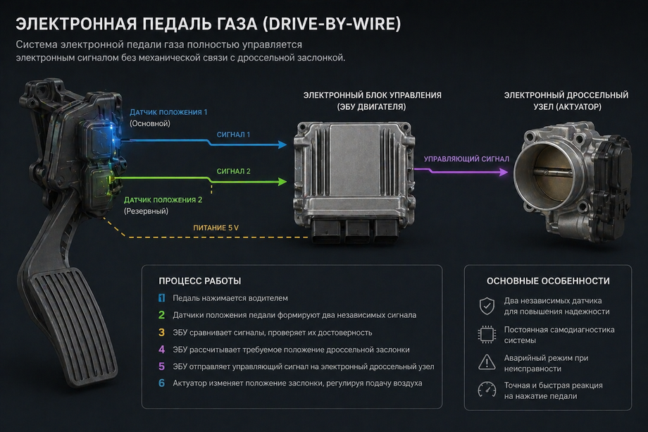 В современных автомобилях используется система drive-by-wire, при которой педаль газа не связана напрямую с дроссельной заслонкой. Нажатие преобразуется в электронный сигнал, который поступает в блок управления двигателем.