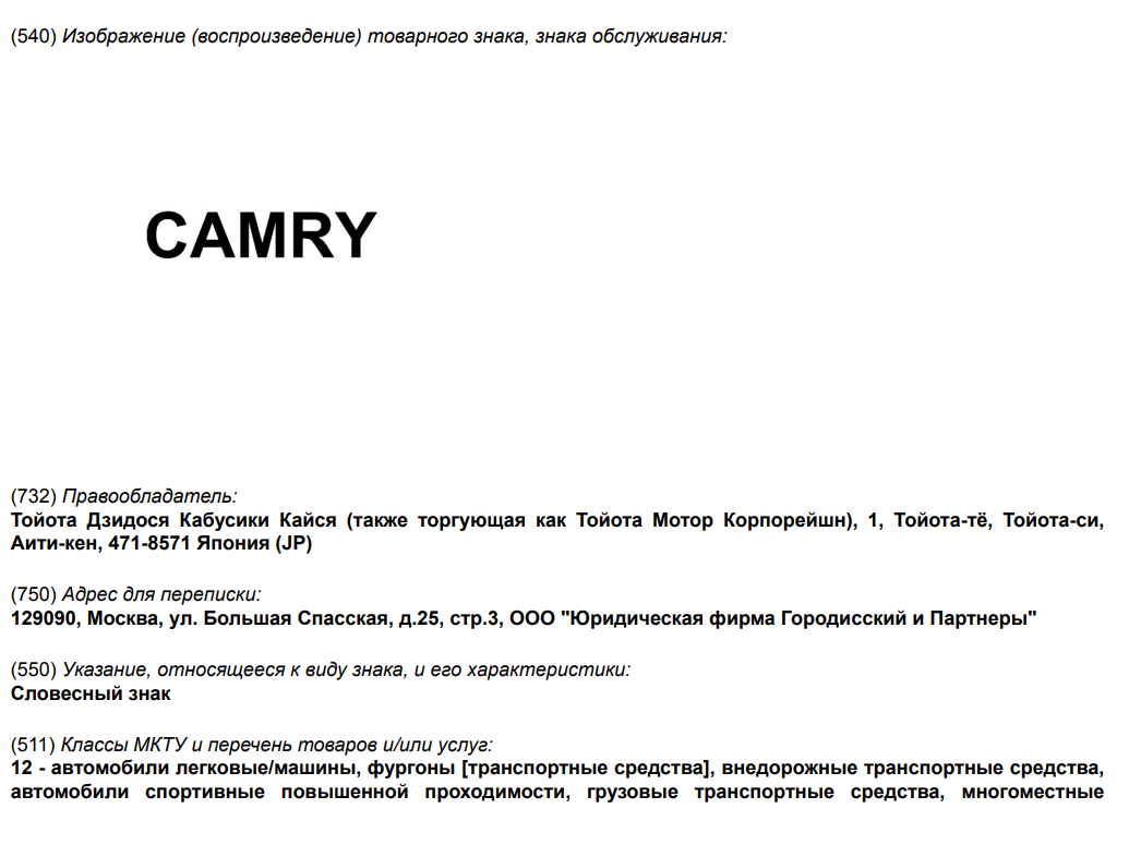 The Japanese company Toyota has registered a trademark in Russia with the name of the popular Camry sedan. As indicated in the open database of the Federal Service for Intellectual Property (FIPS), the trademark passed registration on December 23.