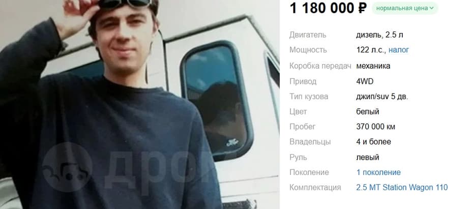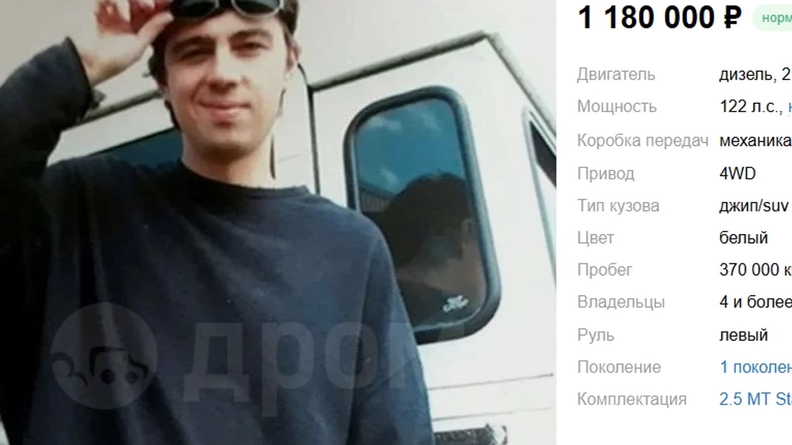 Согласно данным в объявлении, автомобиль оснащен дизельным 2,5-литровым мотором мощностью 122 л.с. с механической коробкой передач. Пробег — 370 тыс. км. К объявлению прилагается снимок Бодрова на фоне этого белого внедорожника.