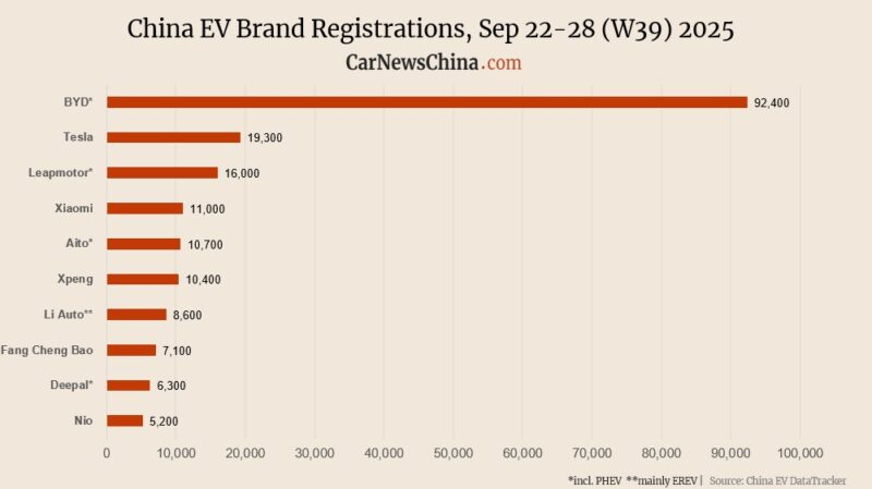 С 22 по 28 сентября 2025 года на китайском рынке новых энергетических автомобилей (NEV) продолжился рост регистраций. По данным China EV DataTracker, лидером остаётся BYD, оформивший 92 400 машин. Это на 30,7% больше, чем неделей ранее (70 700), но на 12,7% меньше результата годичной давности (105 800). С начала сентября BYD зарегистрировал 279 930 автомобилей.