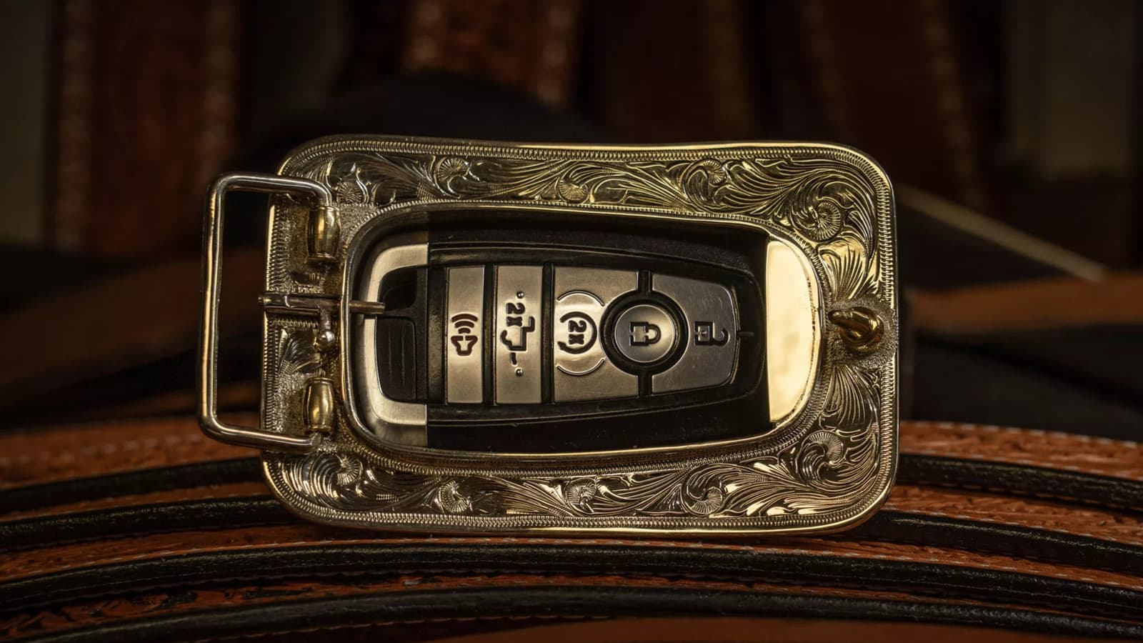 Пряжка выполняет практическую функцию: на ней можно надежно закрепить ключ от грузовика, не вынимая его весь день, при этом Ford продолжает распознавать брелок для бесключевого доступа и запуска двигателя.