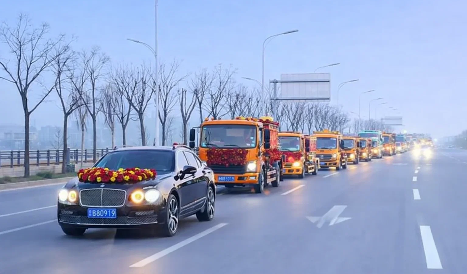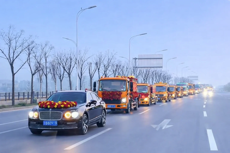 Необычный свадебный кортеж в китайском городе Хуайбэй привлёк внимание: жених использовал девять ассенизаторских машин вместе с легковыми автомобилями.